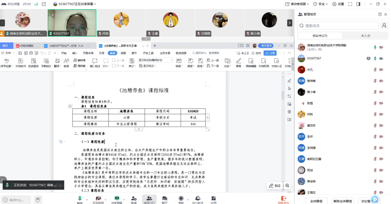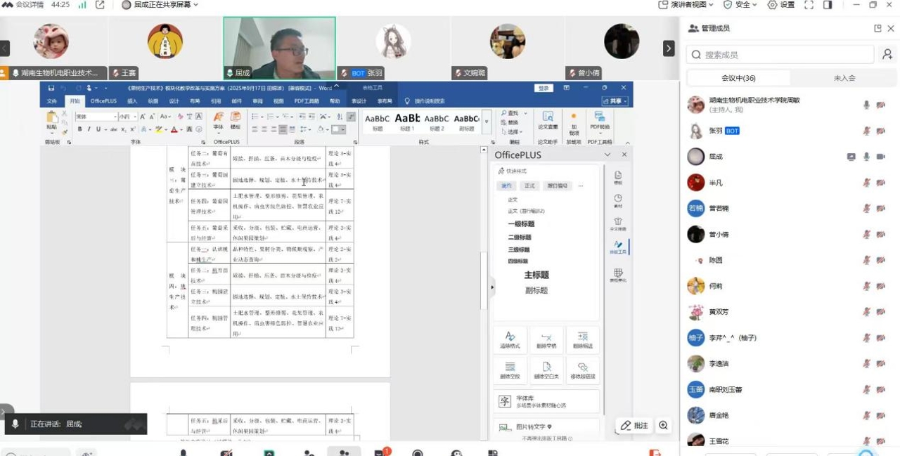 9月24日晚,组织召开了线上指导答疑会。会议由项目负责人植物科技学院周敏副院长主持,邀请了湘西民族职业技术学院崔丽红教授和我校厉佐葵教授、屈成老师参加,分别从课程标准制定、新形态教材编写和模块化教学设计等方面着手,采用“理论讲授+案例点评”的形式指出了学员存在的共性问题,并提出针对性的修改意见。随后,周敏副院长根据研修计划明确了下阶段的学习安排,并要求学员及时提交返岗实践计划和相关成果材料,于10月18日-19日集中到校开展项目总结汇报。最后,各位专家对学员提出的问题进行了答疑与交流。