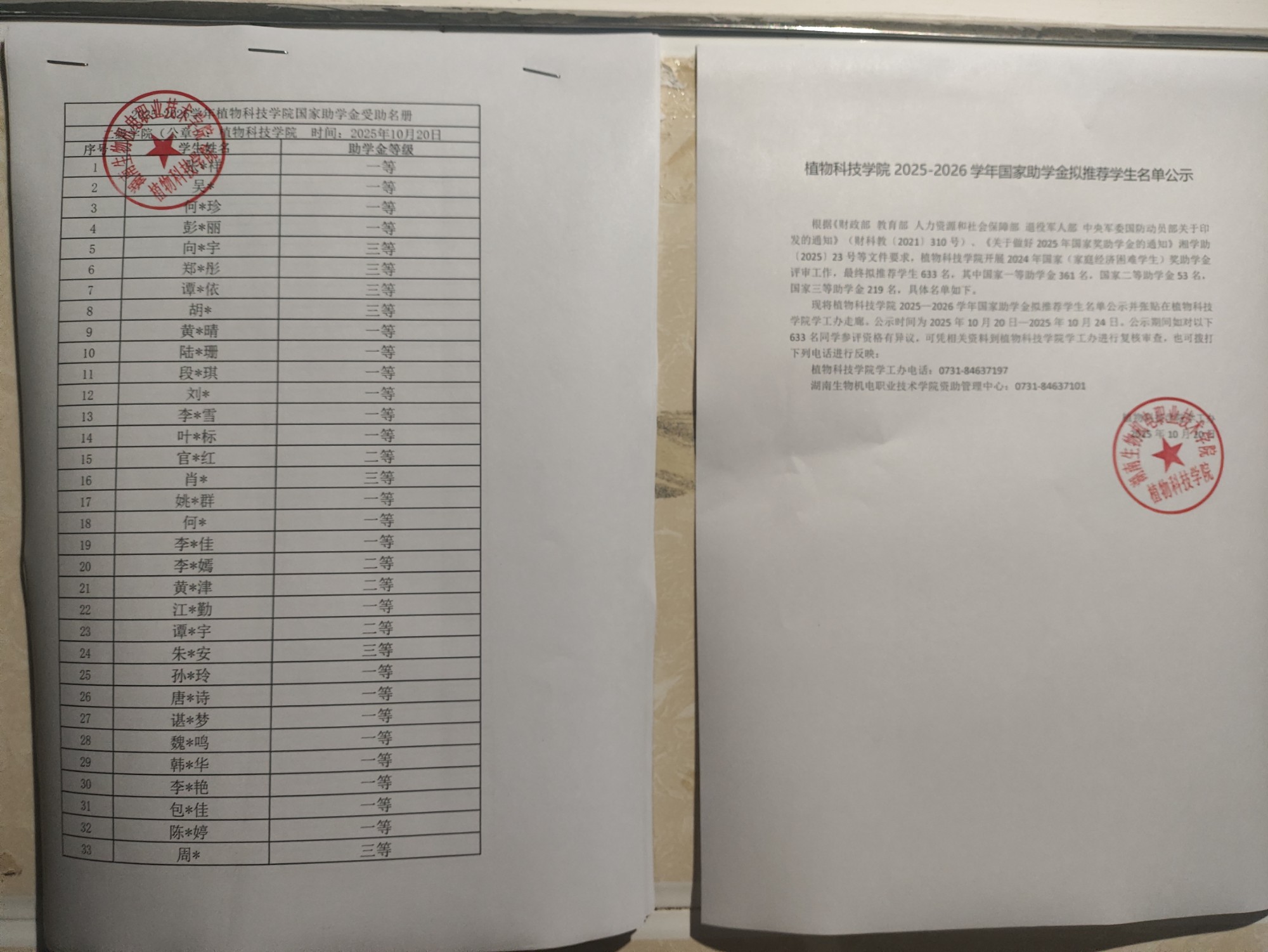 根据《财政部 教育部 人力资源和社会保障部 退役军人部 中央军委国防动员部关于印发的通知》(财科教〔2021〕310号)、《关于做好2025年国家奖助学金的通知》湘学助〔2025〕23号等文件要求,植物科技学院开展2025-2026学年国家助学金评审工作,最终拟推荐学生633名,其中国家一等助学金361名,国家二等助学金53名,国家三等助学金219名,具体名单如下。