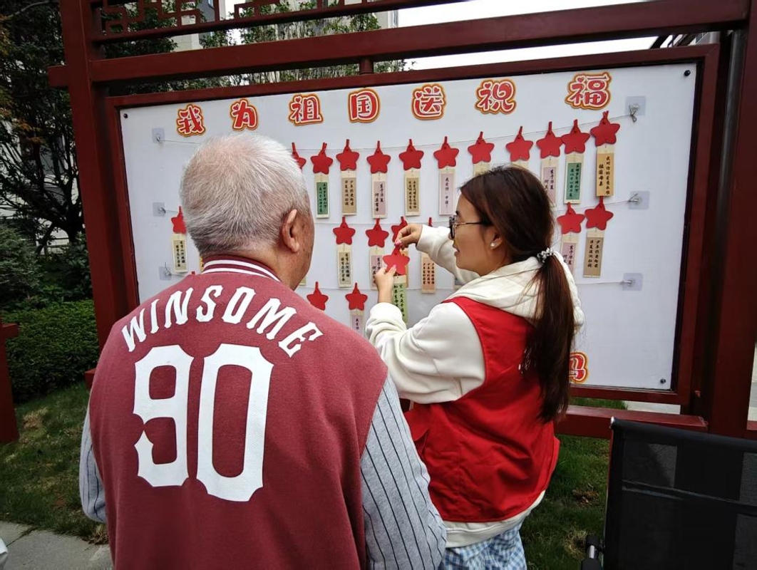 活动现场,植物科技学院志愿者们活跃在各个角落,为活动顺利开展提供有力支撑。在“互动实践区”,他们引导辖区居民、青少年参与“我为祖国送祝福”活动,鼓励大家在背景墙上写下对祖国的感言寄语;协助 “非遗拓印・中秋月饼”环节的材料准备,耐心指导家长与小朋友共同制作拓印、绘制中秋月饼图画;在 "智力拼图・中国地图"区域,和居民一起将省(自治区)、直辖市、特别行政区图卡拼成完整中国版图,于互动中厚植家国情怀。